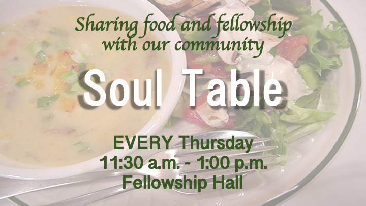 For the first quarter of 2026, Soul Table will take place EVERY THURSDAY from 11:30 until 1:00 p.m. in the Fellowship Hall. Soul Table is a free meal shared through the efforts of FUMC members dedicated to this mission.