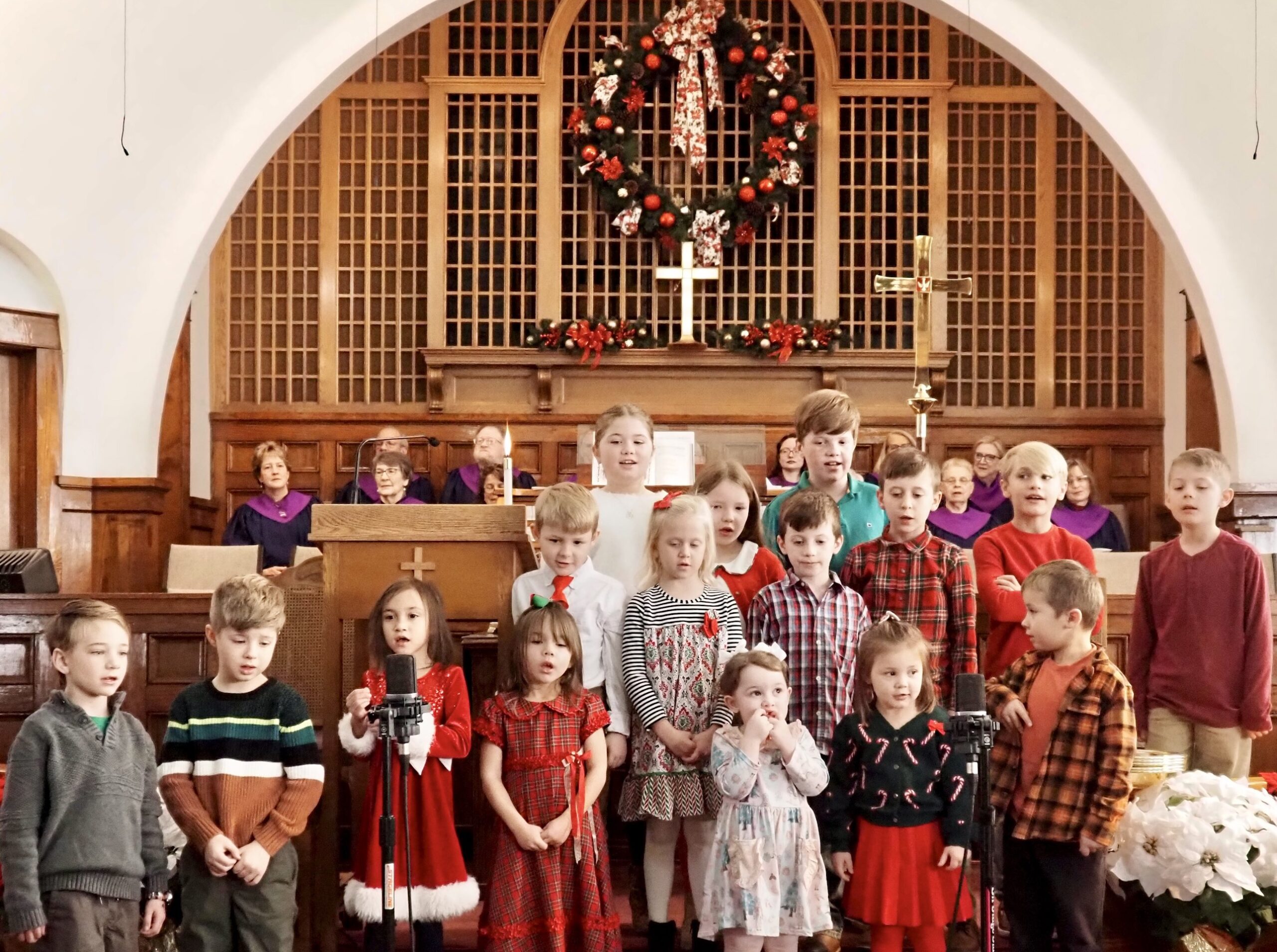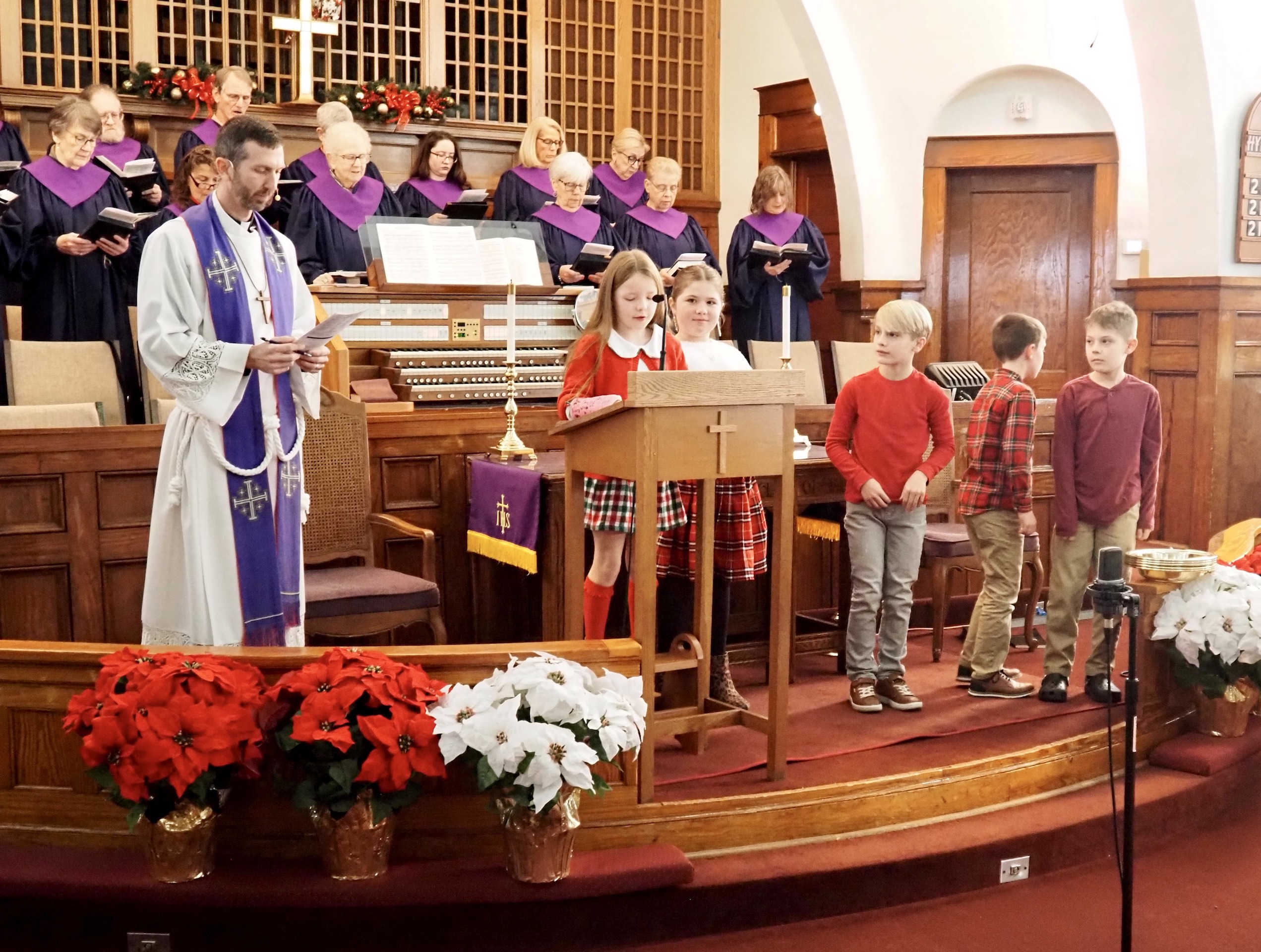 The Children’s Choir for children in grades K-5 learns about how music enriches worship, and they sometimes use instruments as well as their voices. They provide service music and sing in ministry to the elderly and shut-ins.
