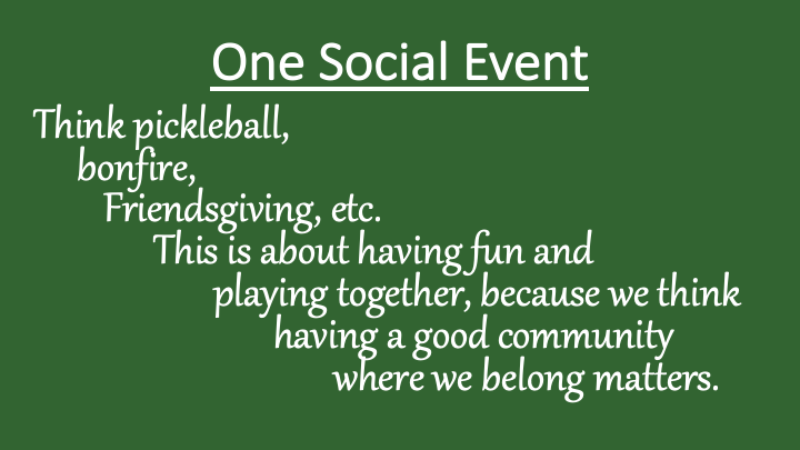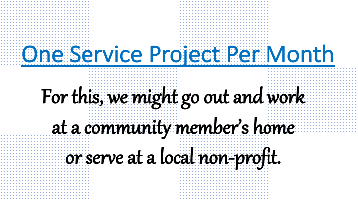 We put a high value on authentic relationships, serving God and neighbor, and growing in our faith.  Our monthly rhythm includes: